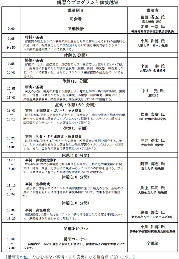 本書籍の発刊を機に、特殊材料溶接研究委員会では、得られた知見をベースにして、わかりやすい講演プログラムに構成した「溶接部の腐食トラブル防止の基礎と実際、-溶接部の耐環境性能とトラブル・対策-」と題する講習会を企画いたしました。この講習会は、過去の腐食トラブルの事例を学術的な観点から掘り下げて解析し、その結果から得られた原因と実務に即した対策について、各分野の専門家がわかりやすく説明する講演と原因解析・対策の裏付けとなる基礎的知見(ステンレス鋼等鉄鋼材料の基礎、溶接の基礎、腐食の基礎)の平易な解説から構成されており、専門外の方々にも理解しやすい内容となっています。