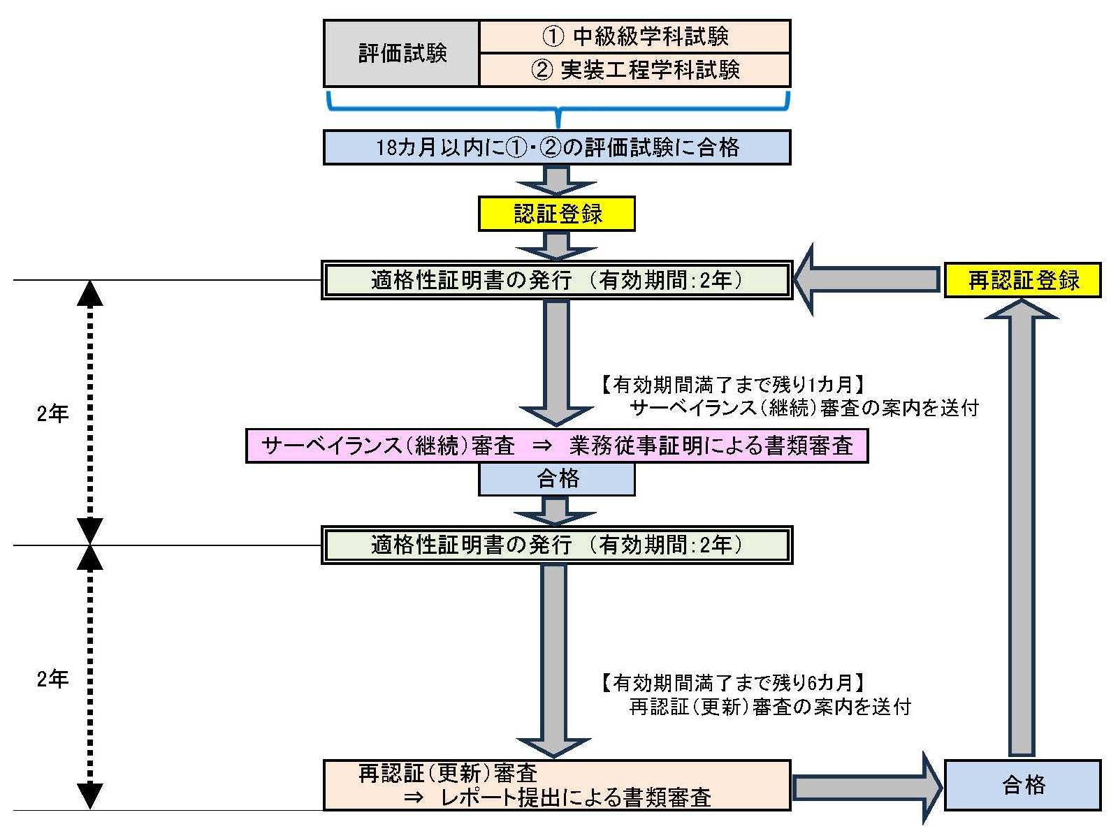| サーベイランス(継続)審査 | 当協会から有効期間満了前40⽇以内に送付した申請書類による、前回登録以降の2年間の業務従事証明の書類審査 |