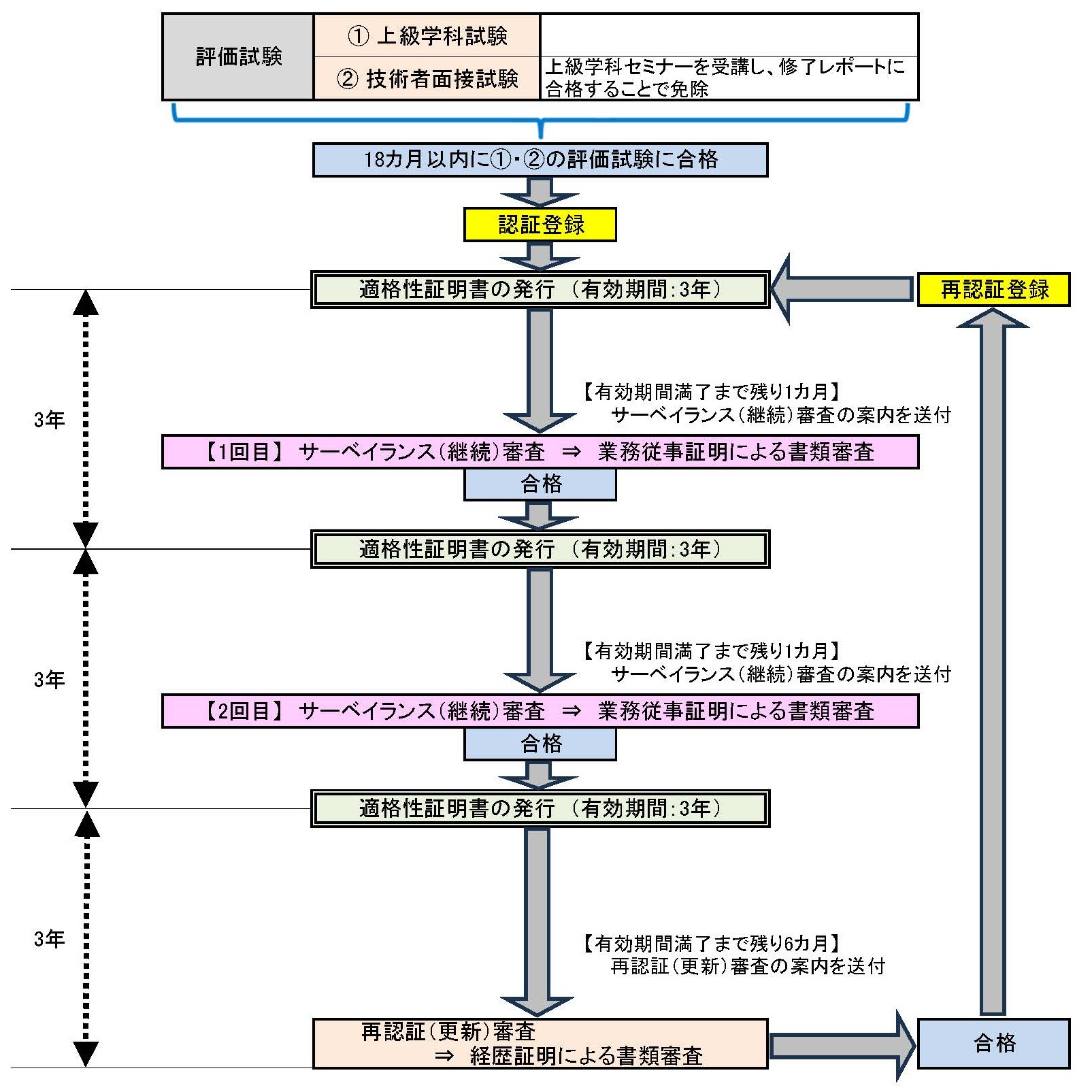 | 評価試験 | 上級学科試験: 記述式・記号選択・○×選択(150分) 技術者⾯接試験: 口頭諮問(30分) |