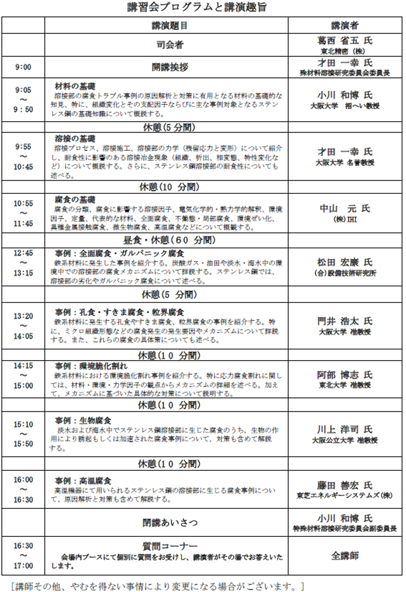 本書籍の発刊を機に、特殊材料溶接研究委員会では、得られた知見をベースにして、わかりやすい講演プログラムに構成した「溶接部の腐食トラブル防止の基礎と実際、-溶接部の耐環境性能とトラブル・対策-」と題する講習会を企画いたしました。この講習会は、過去の腐食トラブルの事例を学術的な観点から掘り下げて解析し、その結果から得られた原因と実務に即した対策について、各分野の専門家がわかりやすく説明する講演と原因解析・対策の裏付けとなる基礎的知見(ステンレス鋼等鉄鋼材料の基礎、溶接の基礎、腐食の基礎)の平易な解説から構成されており、専門外の方々にも理解しやすい内容となっています。